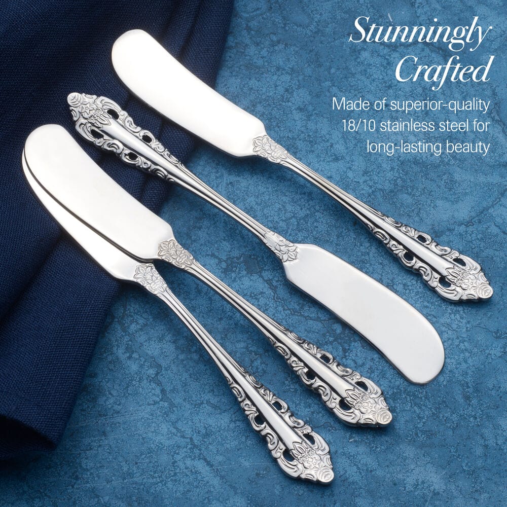 These Wallace Antique Baroque spreaders are styled with a historical sensibility. each piece is elaborately sculpted with curling tendrils along pierced edges. culminating in a gently pointed end.