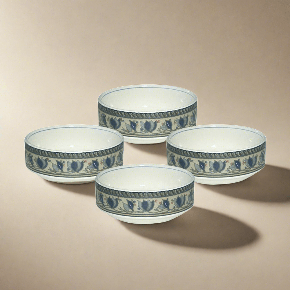 This elegant casual stoneware dinnerware has been a favorite since its introduction in 1986. The bold stylized navy blue tulips and vines on a rustic background flow around each of the pieces. Add the creamer and sugar. oval covered casserole. or any of the accessory pieces to expand your elegantly casual table. And once the dinner is over. all the pieces can go in the dishwasher for easy clean up. The pattern is also oven safe. microwave save and freezer safe. Set of 4 fruit bowls. each measures 5 inch diameter and holds 15 ounces.