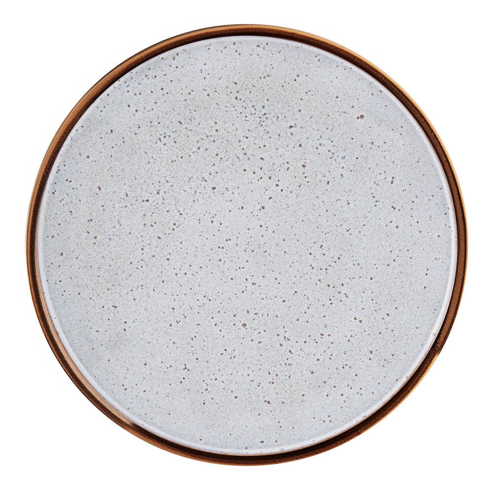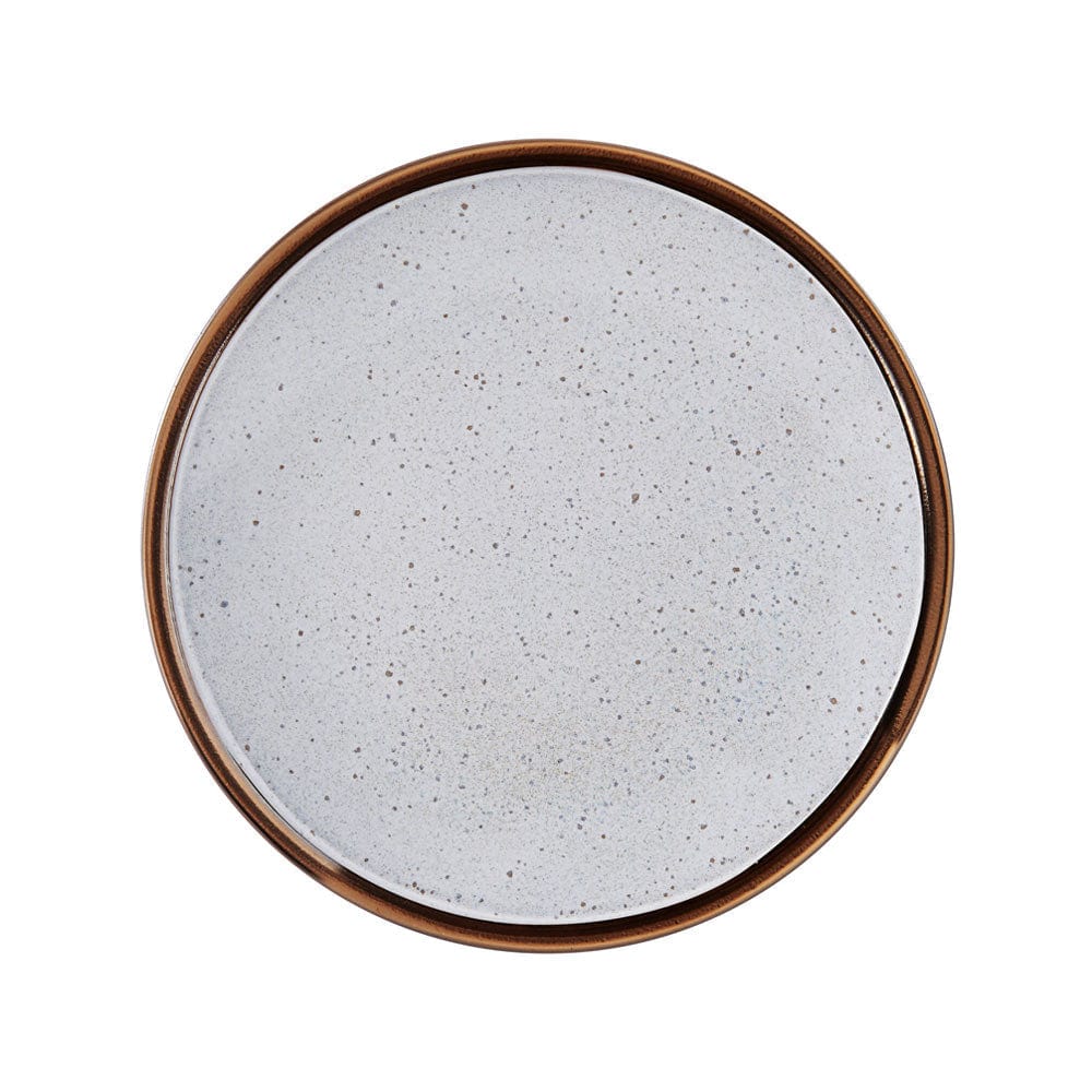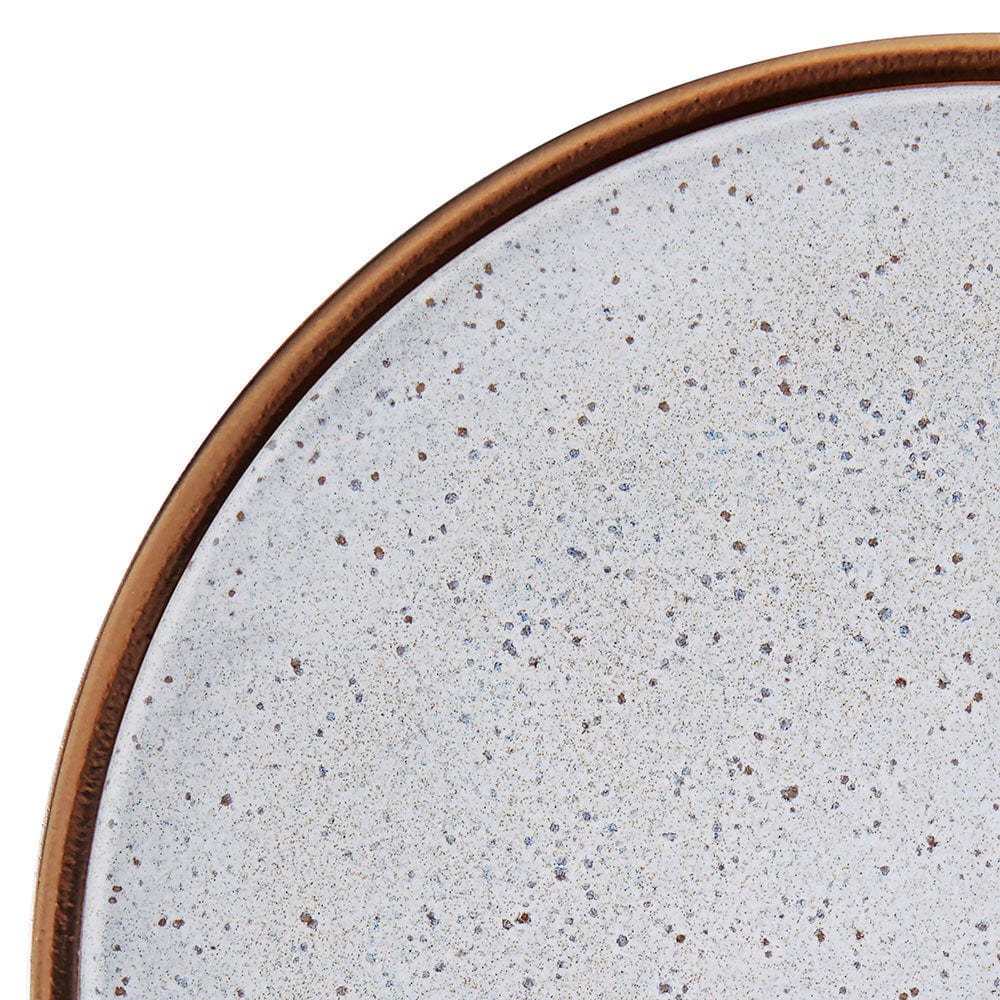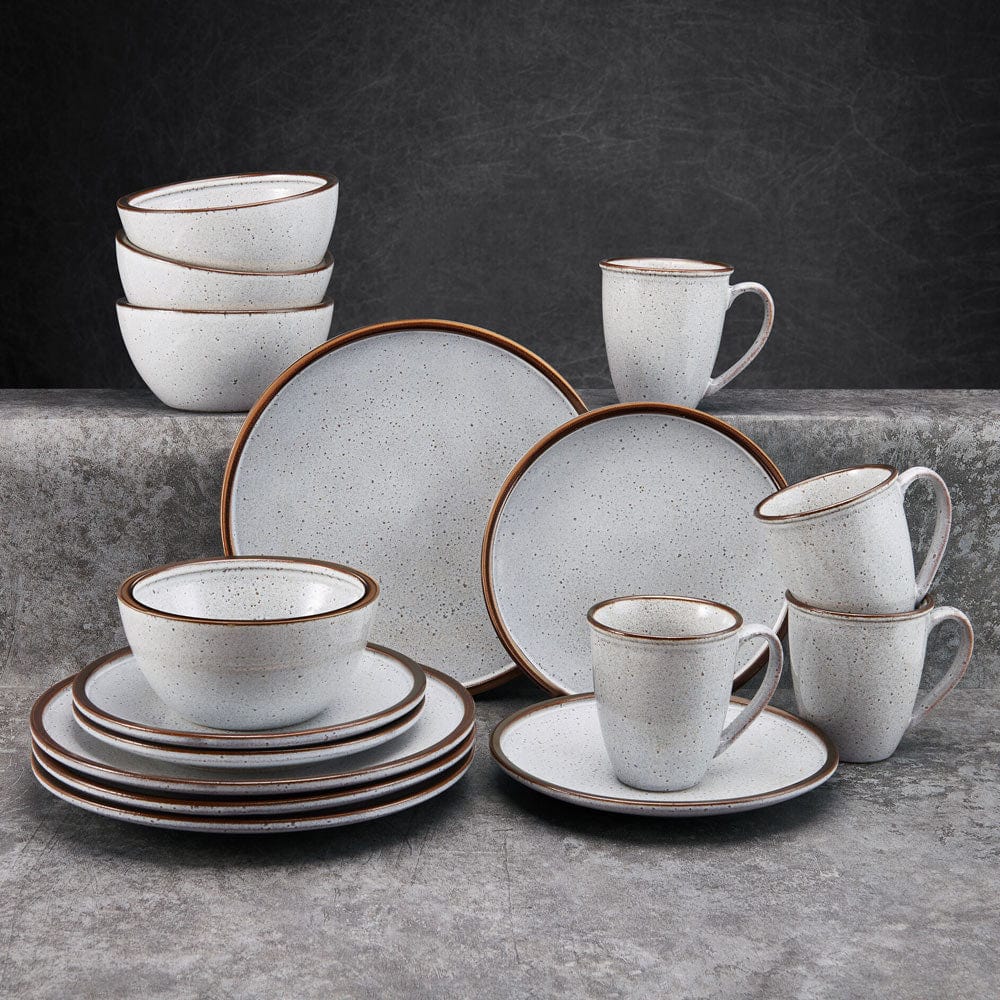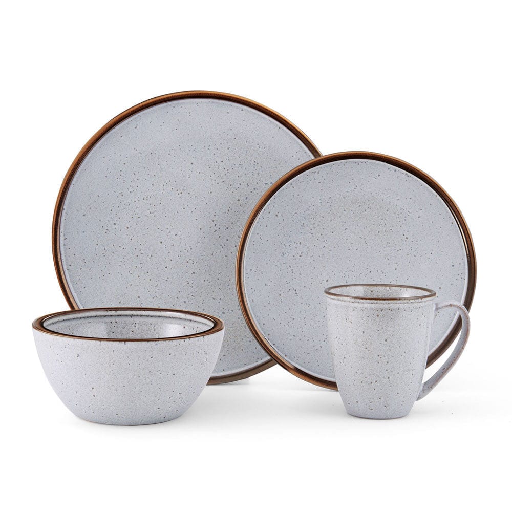 This Mikasa Barrett White Dinnerware Set features a white speckle pattern that dazzles with a glossy finish and a thick metallic band around the edge. bringing a stunningly modern look to all your gatherings.