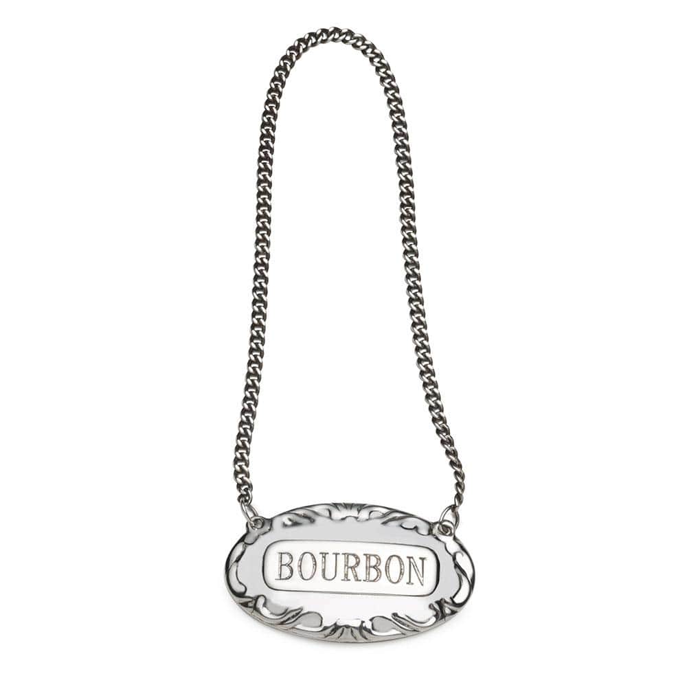 Add elegance to your home bar with this Empire Silver Bourbon Liquor Label. This liquor label includes a silver chain to hang around the neck of your decanter with the word Bourbon. Bring the luxury of sterling to your cocktail hour for elegance and sophistication.