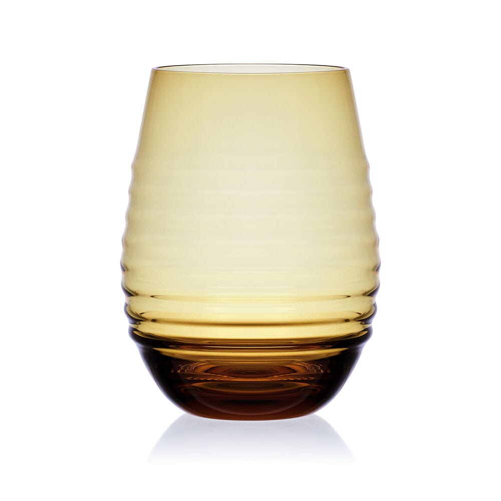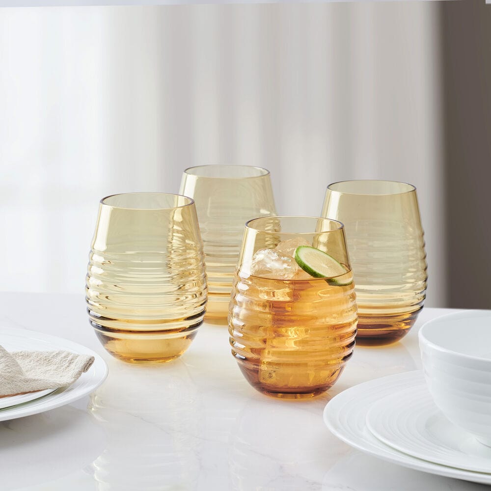 Simple and stylish. this Ciara Set of 4 Stemless Green Wine Glasses is ideal for elevating any occasion. Made of high-quality. lead-free crystal. each glass features a thick base and a contemporary. soft ribbing design that complements any flatware or dinnerware. Sophisticated and stylish with a modern twist. stemless wine glasses can be used to serve a variety of cocktails or as drinking glasses for enjoying cold beverages.
