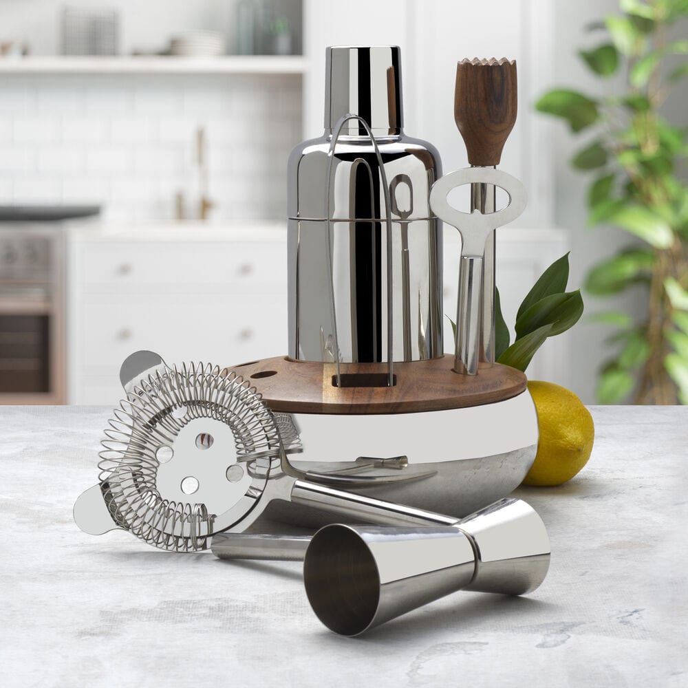 Elevate your home bar to new heights with our Classic Bar Tool Set. Designed to impress even the most discerning cocktail connoisseurs. this set provides everything you need to craft and serve your favorite libations with style and sophistication. These bar tools are weighty and built to last. Set includes a cocktail shaker. double jigger. strainer. muddler. ice tongs. and a bottle opener. Keep your bar tools neatly organized and readily accessible with the included stand which not only adds a touch of sophistication to your bar area but also ensures that your tools are always within arm’s reach. Bonus Nut Bowl; easily lift up the stand to use the base as a beautiful and functional nut or snack serving bowl.