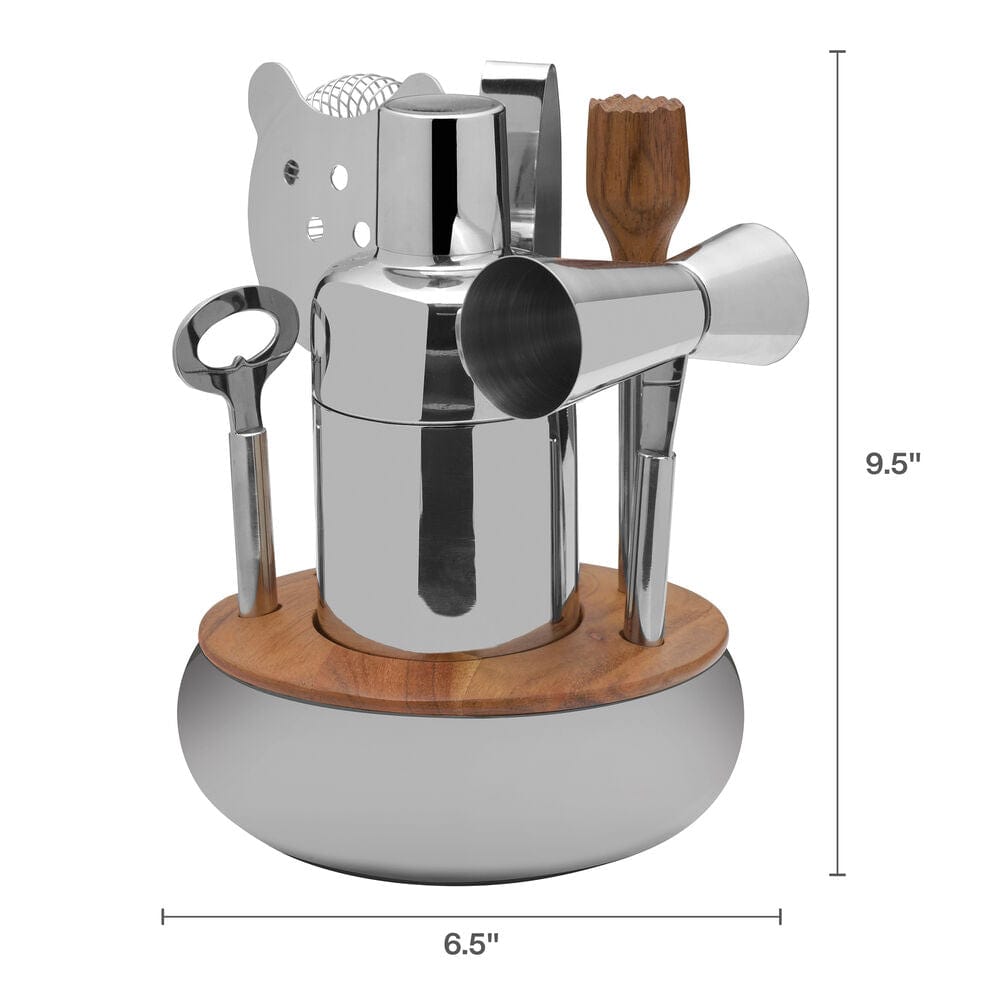 ? Measures 9.5 inches high by 6.5 inches in diameter. cocktail shaker holds 530ml ? Crafted of Stainless Steel and Acacia Wood ? All pieces are dishwasher safe except for the stand which can be wiped clean with a damp cloth