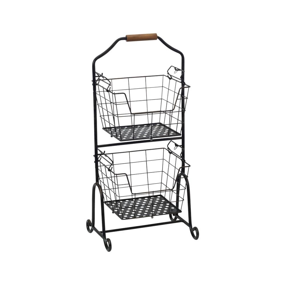 This Ferme 4 Tier Standing storage rack is a practical and stylish storage solution that will bring organization to any room of the house. Standing Rack is adjustable to hold 2. 3 or 4 baskets. Each of the 4 baskets is ideal for holding everything from fruits and vegetables to toys and linens. Accented in antique black finish with an acacia wood handle. rack is crafted from wrought iron for long-lasting beauty even under rigorous use. Wipe Clean with a damp cloth. Adjustable Standing 4 Tier Rack measures 51 x 13-1/2 x 12 inches. Baskets measures 11 inch square. 7 inches high. 3 Tier measures 40-1/2 inches high. 2 Tier measures 29-1/2 inches high. This product contains Carbon Black. For more information about chemicals in this product. visit