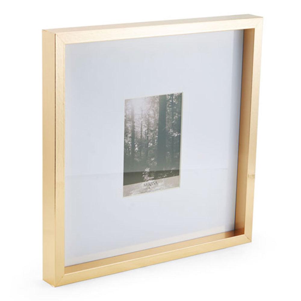 This Mikasa Gold Matted Gallery Square Frame features a sleek. streamlined wood frame with clean lines and angles. with a stylish. contemporary. metallic gold finish. The opening contains an eye-catching thick white square matte that borders your photo in the frame to enhance the visual appeal on your wall.
