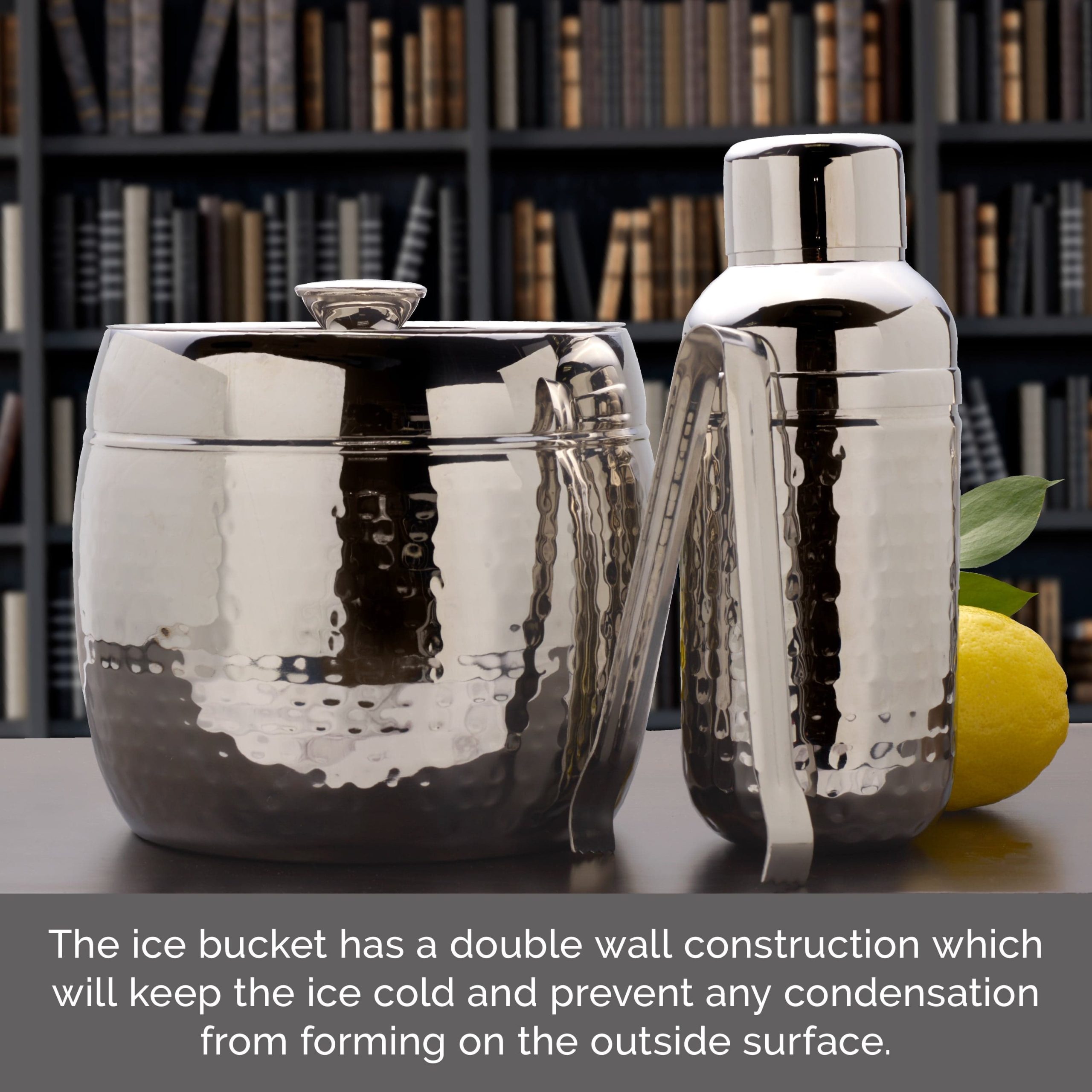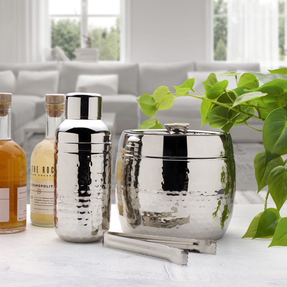 This 3-piece Hammered Bar Collection will help create a festive mood at any gathering. Mix drinks in style with this striking 3 piece bar set. The set includes a soft hammered cocktail shaker. a double-walled ice bucket and a pair of ice tongs. Perfect for gift giving. or use for everyday home entertaining.