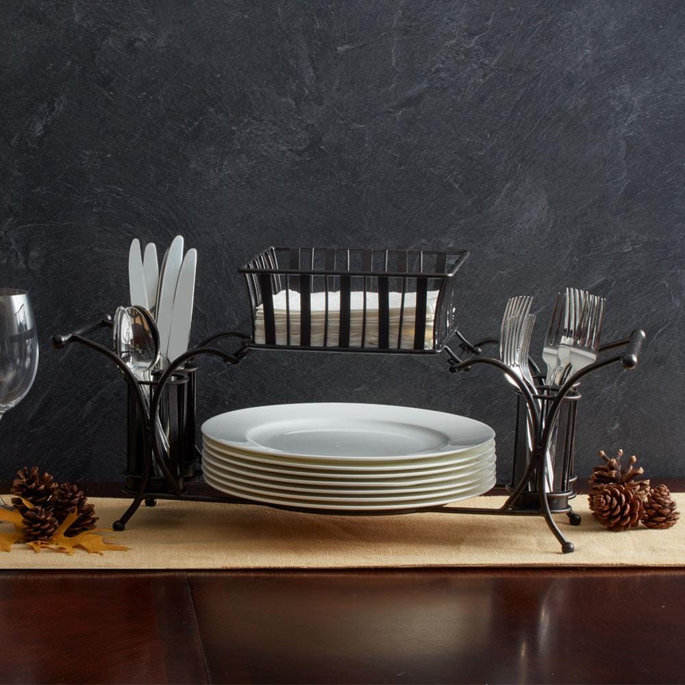 This Buffet Storage Caddy is a striking way to keep plates and flatware organized and easily accessible to guests. Caddy features four flatware compartments. center plate holder and a removable napkin caddy. Handcrafted from iron for long-lasting beauty even under rigorous use. Wipe clean with a damp cloth. Measures 21 x 8 x 7-1/2 inches. Napkin basket measures 8 inch square x 3-3/4 inch high.