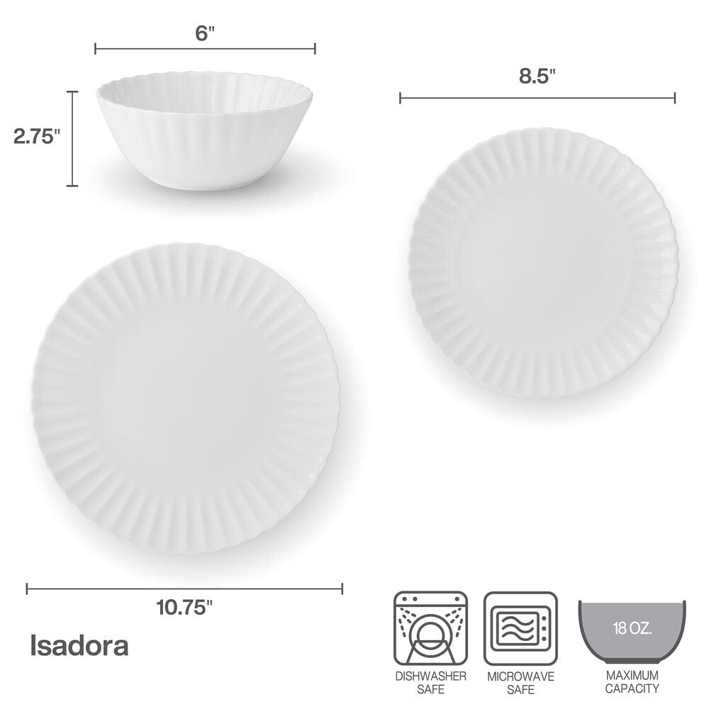 Sophisticated and stylish. this Isadora 12-Piece Dinnerware Set brings a fresh look to your tabletop with contemporary shapes highlighted by scalloped rims. Stunningly crafted for long-lasting durability. this elegant collection in basic white and can be used for everyday dining or more formal dinner gatherings.