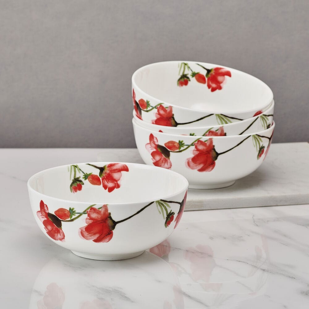 Add charm and a splash of color to your table setting with this Keira Set of 4 Soup Cereal Bowls. This beautiful bone china plate features a stunning watercolor red floral design on crisp white. Perfect for any casual occasion.