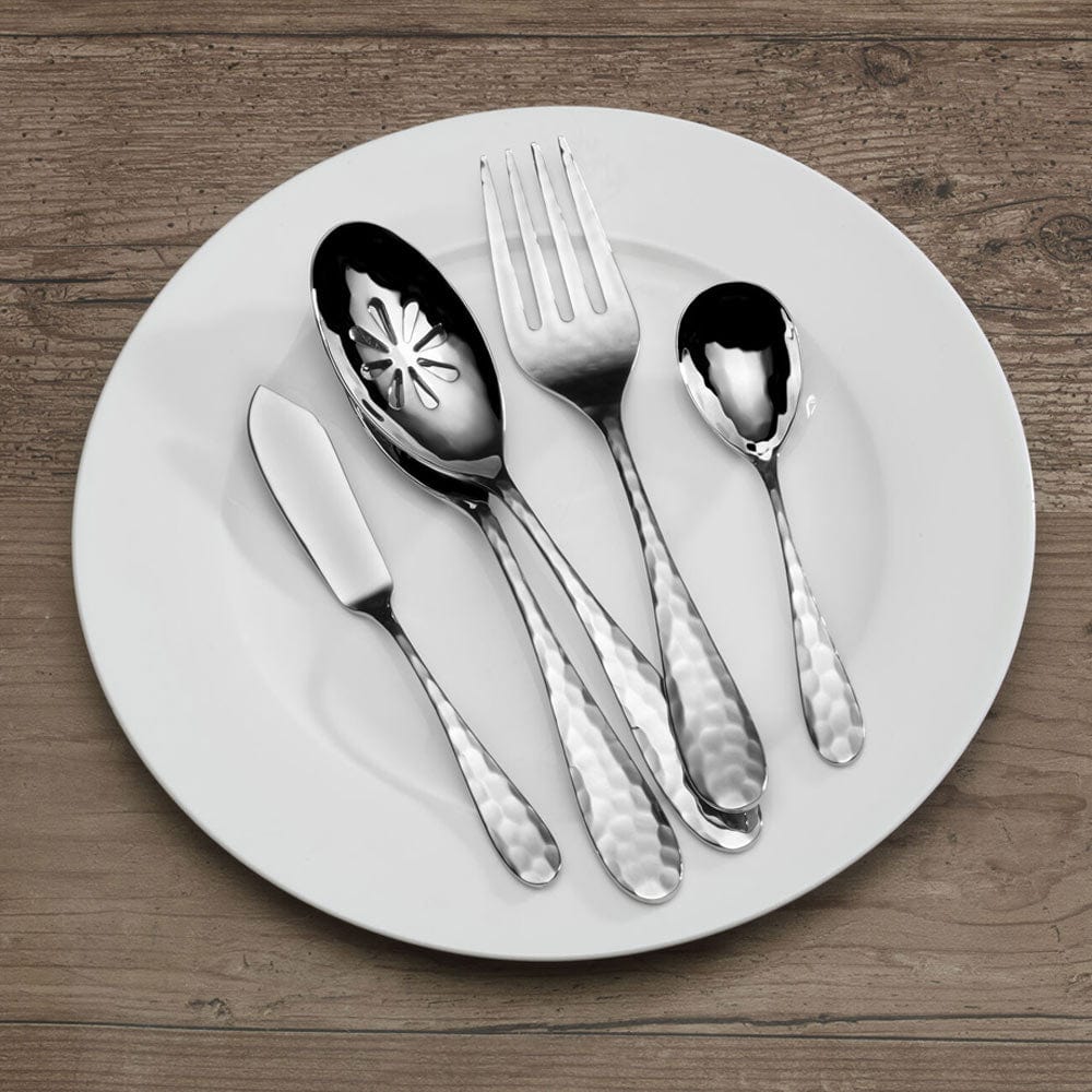 This Mikasa Lilah Flatware features a classic design and casual hammered tone making it perfect for an elegant dinner or casual brunch. Quality crafted of 18/10 stainless steel. 45 piece set. service for eight. includes (8) each: dinner fork. salad fork. dinner knife. dinner spoon and teaspoon. plus (1) each: tablespoon. pierced tablespoon. cold meat fork. sugar spoon and butter knife. Dishwasher safe.