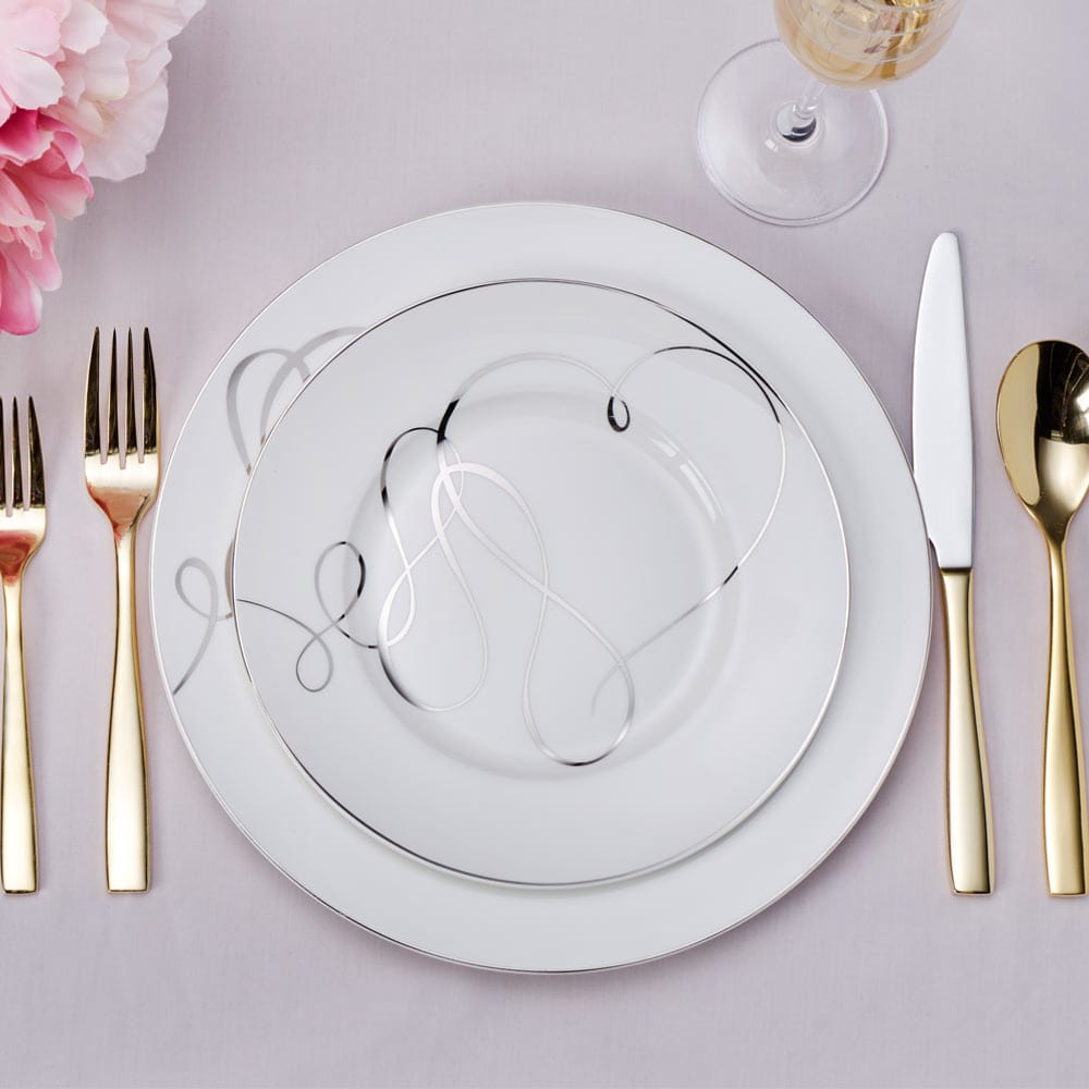 This Love Story Dinnerware Set features graceful bands of platinum that wide their way across each piece. and will help you celebrate true love and timeless elegance. This classic dinnerware pattern will be treasured for years and anniversaries to come.