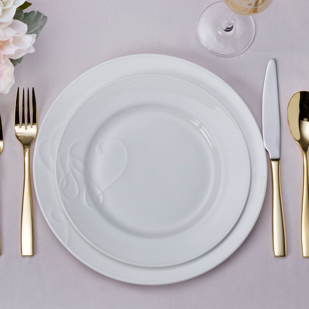This Love Story White Dinnerware Set features a white body. with a distinctively different embossed pattern decorating the rim of each piece. and the elegant design can be used for formal or casual entertaining.