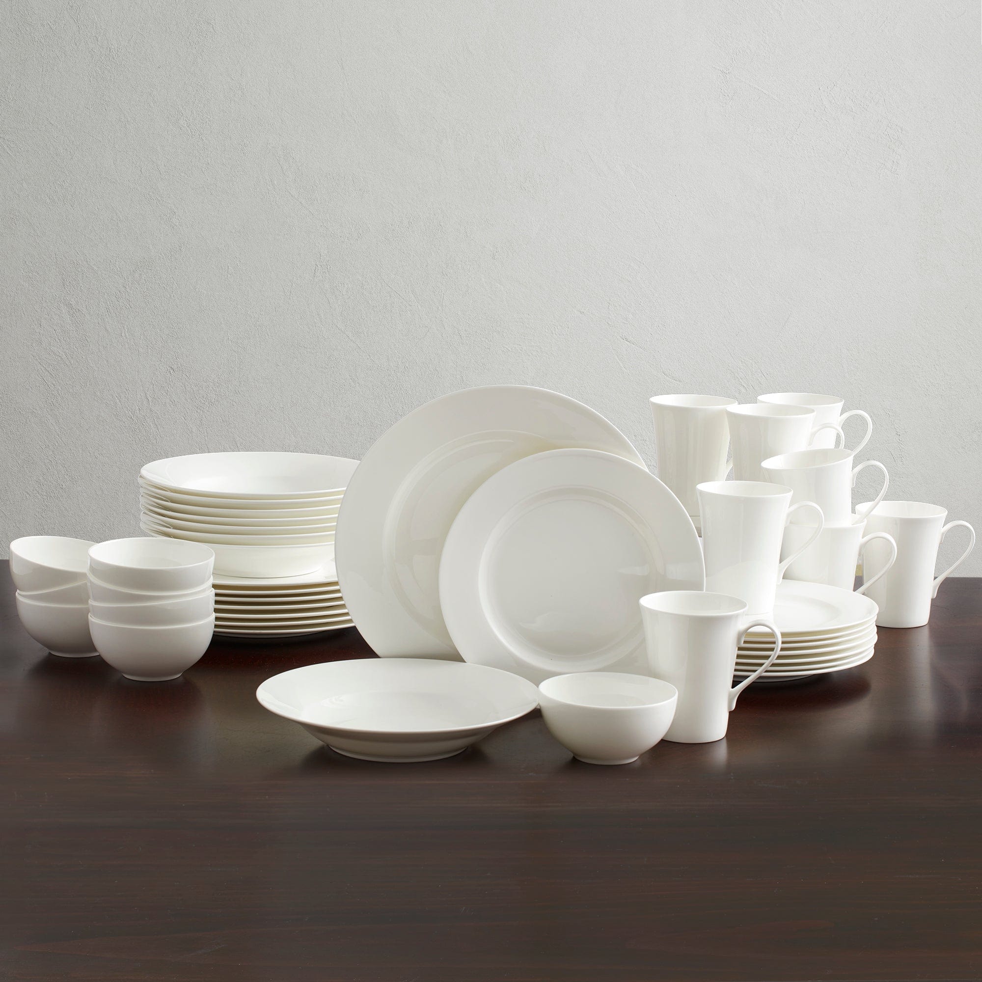 - 40 piece dinnerware set. service for eight. includes (8) each: 11 dinner plate. 9 salad plate. 9 (8.75 oz.) rim soup bowl. 4.5 (10 ounce) fruit bowl and 14 ounce mug.