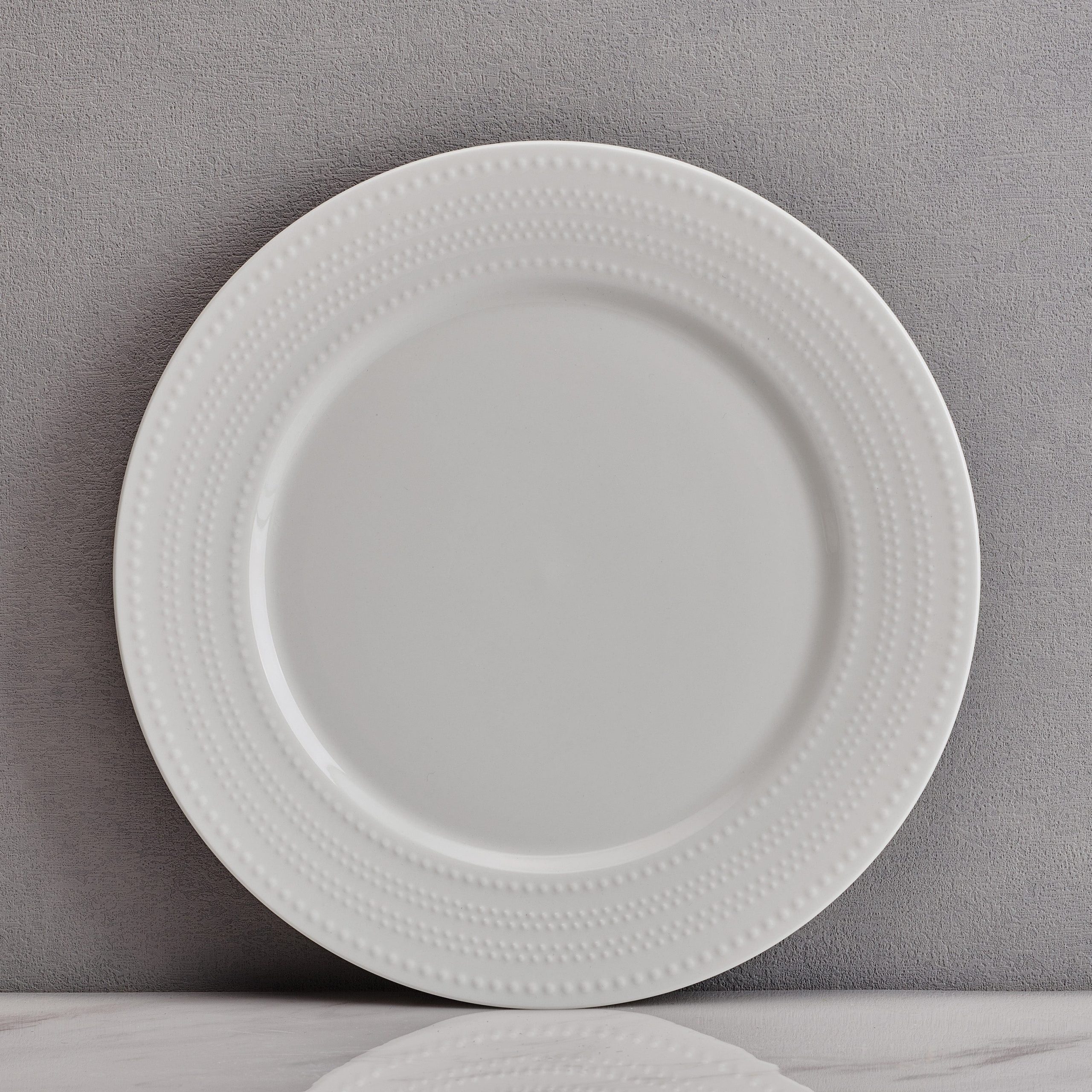 This Nellie Set of 4 Dinner Plates features exquisite embossed detail in a delicate embossed dot design. creating eye-catching depth and movement on your tabletop.