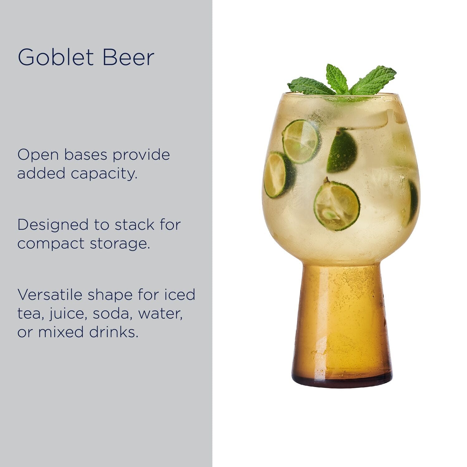 This Phoebe Amber Beer Goblet Glass Set features a modern amber tint. with a wide. open base that provides added capacity. and perfect for serving a variety of cocktails or cold beverages. For convenience. glasses stack for compact storage.