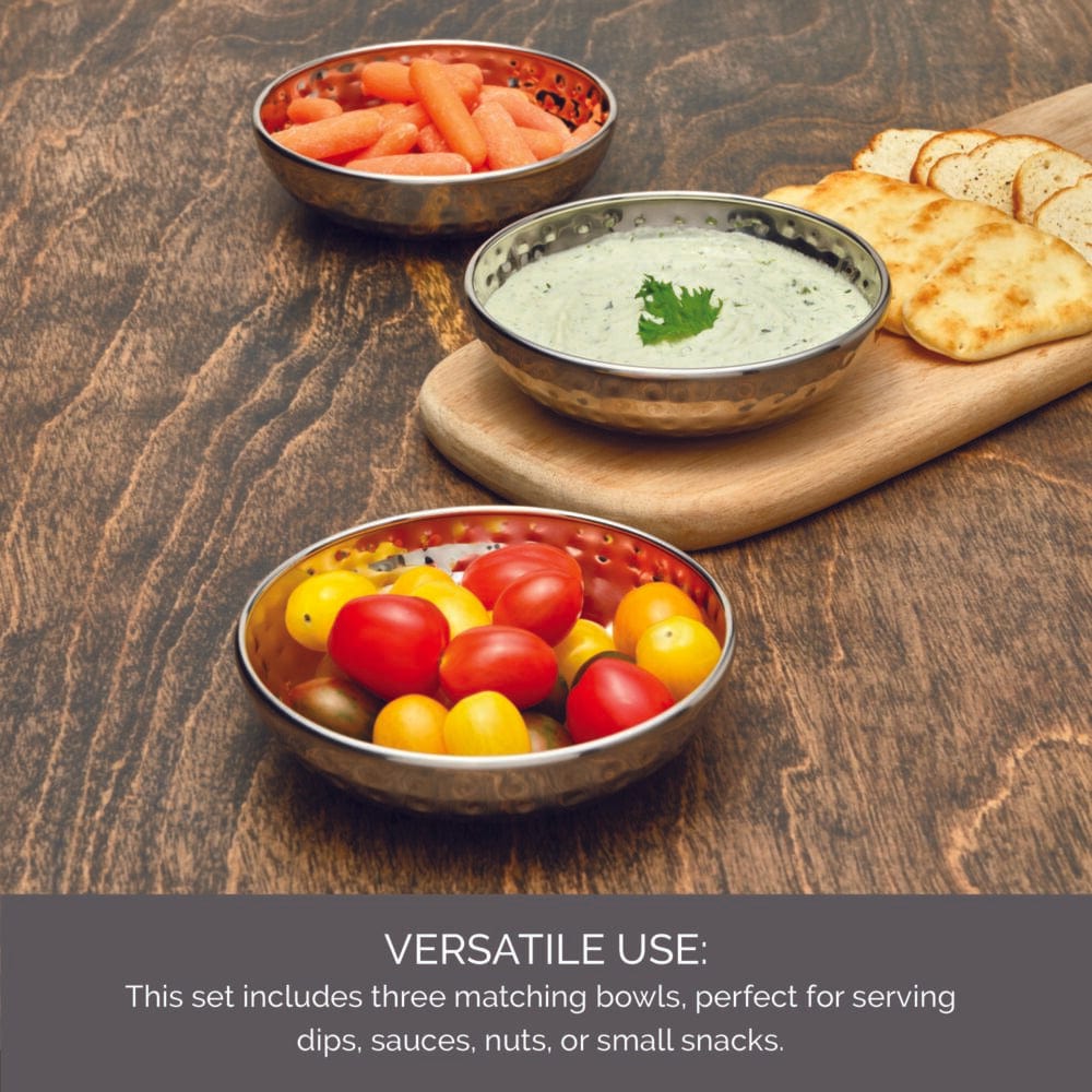 Add timeless elegance to your serveware collection with the Radiance Set of 3 Hammered Bowls. These bowls are the perfect size for serving dips. sauces. nuts. or small snacks. Their compact design makes them versatile for entertaining. everyday meals. or even as decorative accents. Whether hosting a formal dinner or casual gathering. the Radiance Bowls offer functionality with a touch of sophistication. Bring brilliance to your serving experience with this stunning trio.