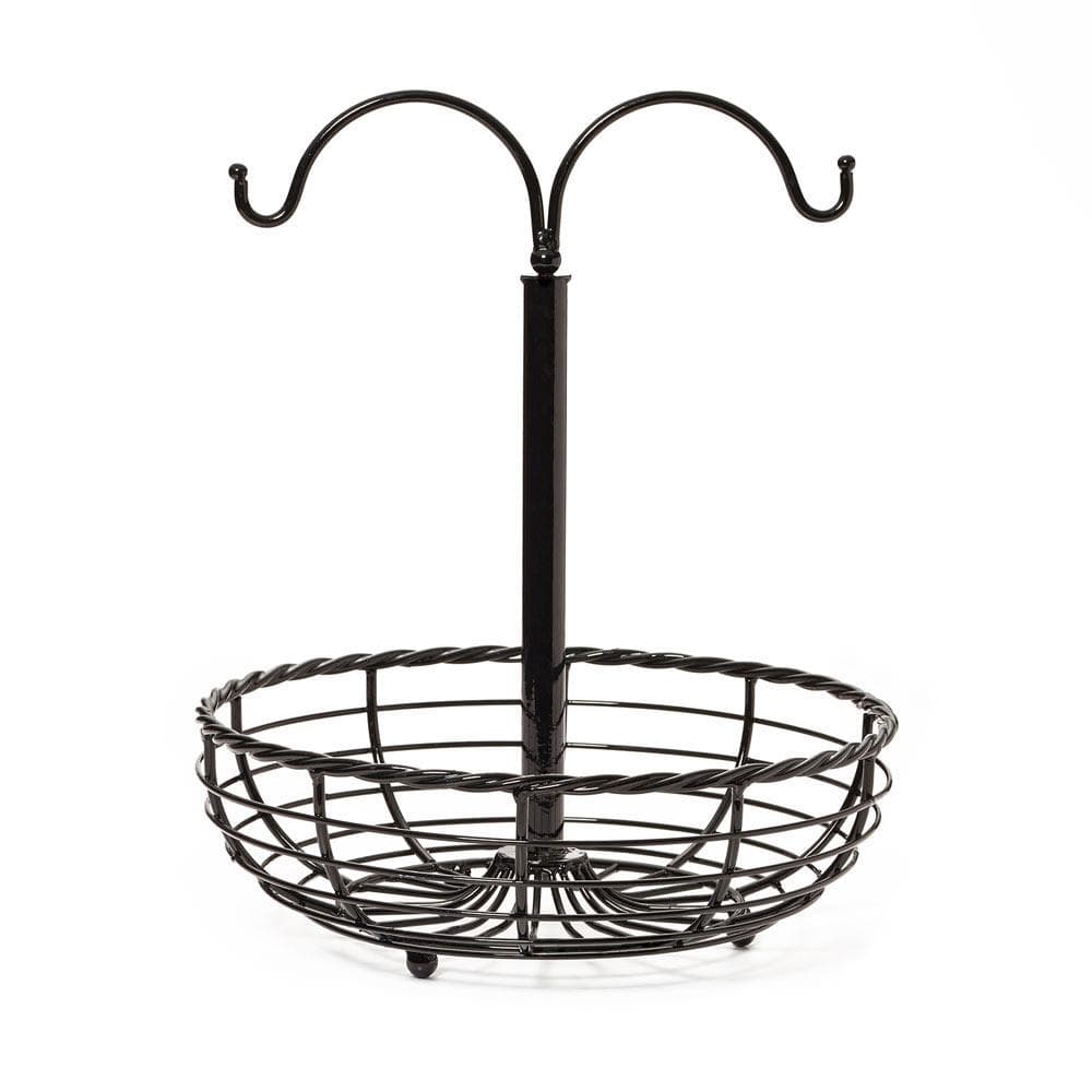 This Rope Fruit Basket with Double Banana Hook is a unique product featuring two banana hangers and fruit bowl in one convenient design. The basket allows for air to naturally ripen fruit. while the banana hangers prevent bruising. Hand crafted from iron with a rope design. makes this piece the perfect accent to your countertop. Wipe clean with damp cloth. Measures 12 x 12 x 15 inch high. This product contains Carbon Black. For more information about chemicals in this product. visit