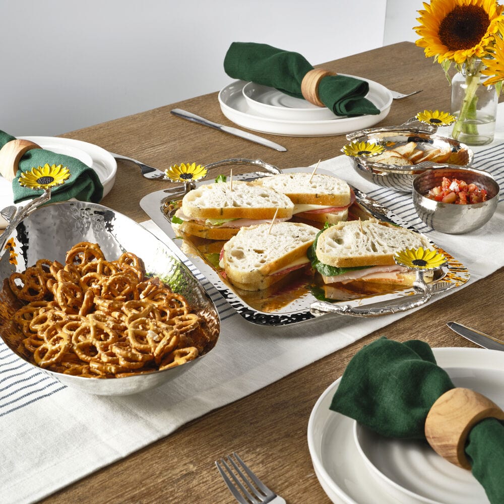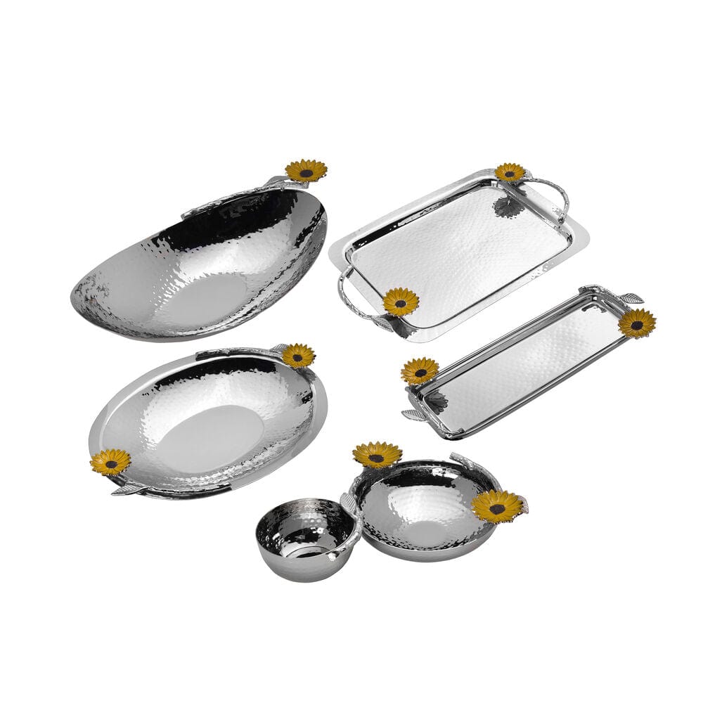 This elegant and lustrous Sunflower chip and dip server will brighten up any gathering. Designed to bring both beauty and functionality to your table. this stylish serving set. A captivating hammered interior. smooth exterior. and vibrant yellow sunflower and leaf accents. Make every party blossom with this eye-catching centerpiece that combines convenience. elegance. and a touch of sunny charm!