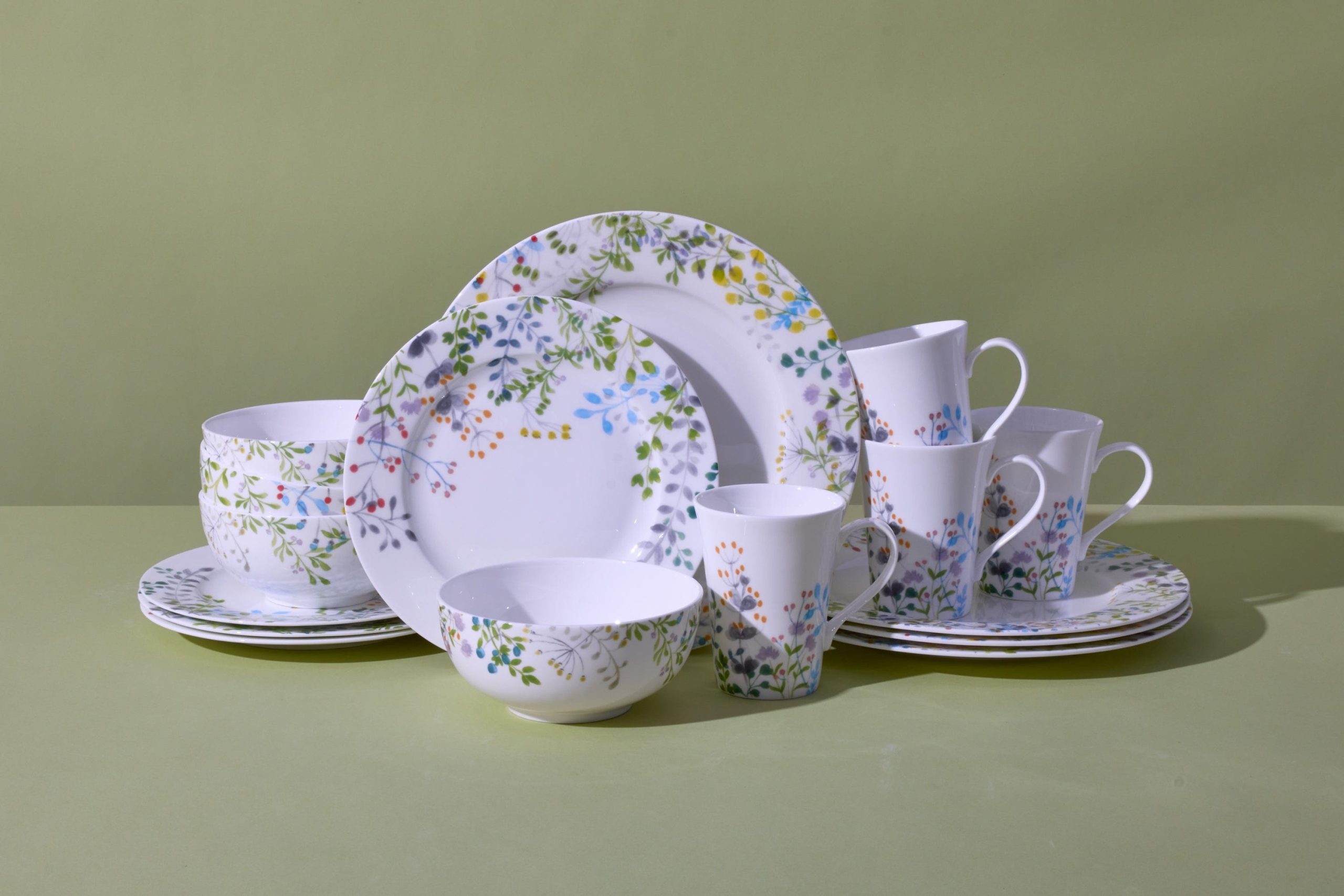 Tivoli Garden breathes new life into your table setting. Vivid white pieces serve as a flower bed from which sprout colorful. delicate buds. making every meal like a walk through a fresh spring meadow. Crafted of high quality bone china. Microwave. oven. freezer and dishwasher safe. 16 piece dinnerware set. service for four. includes (4) each: 11 inch dinner plate. 9 inch salad plate. 5-3/4 inch (24 ounce) soup bowl and 13 ounce mug.