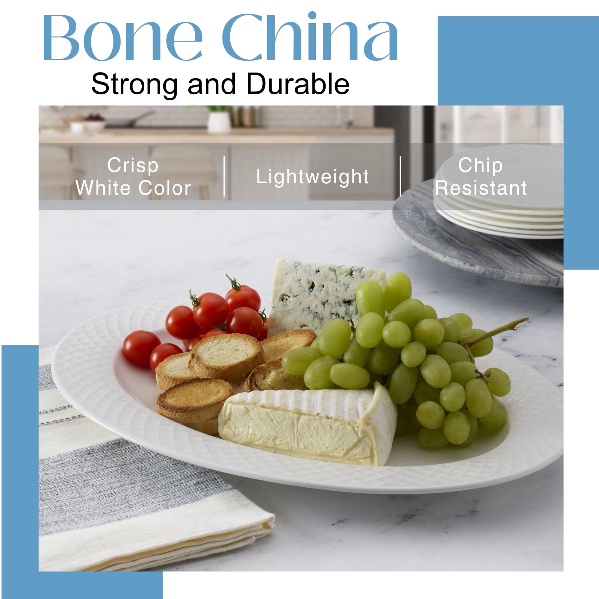 This Trellis White Oval Platter features a contemporary. criss-cross line design. creating eye-catching depth and movement on your tabletop. This casual and stylish dish is perfect for everyday use.