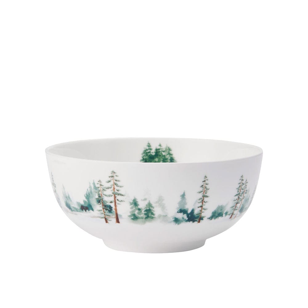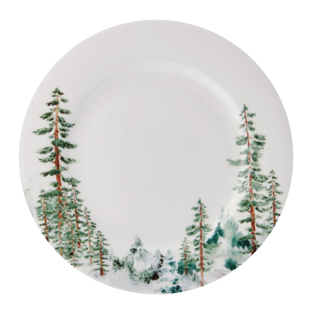 This Watercolor Forest Dinnerware Set features beautiful pine trees emerging from the lower portion of each piece. creating an eye-catching visual landscape on the bright white surface. and the trees even carry through to the insides of the bowls and mugs.